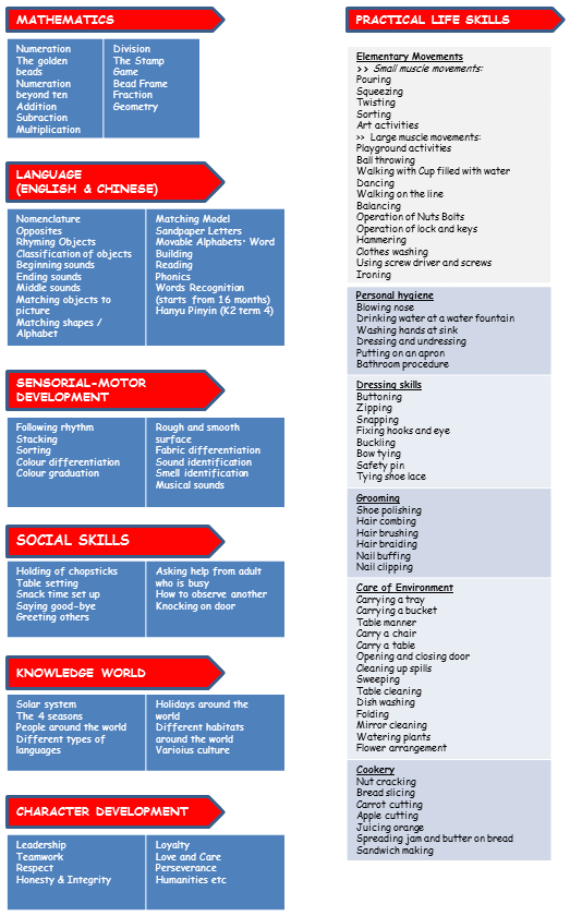 The Playgroup & Pre-Nursery programs engage children in learning activities in the area of English literacy, Chinese language, Mathematics, Science, and Technology and Arts. Early learning experiences are facilitated in the classroom.